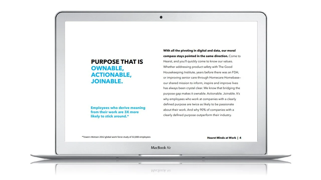 With the launch of new initiatives meant to “further strengthen the corporation while making a positive difference in our broader society,” Hearst was looking to articulate its vision AND values. I know all about Hearst’s good work—having spent a good part of my career there. And know that the best purpose-driven brand narratives are equal parts pledge, rallying cry, and sermon. After all, if you want to move society to action, you’ve got to move employees first. Can I get an amen?