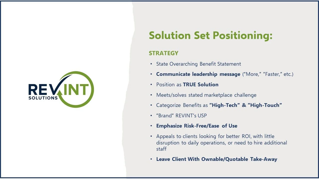 The answer? Unite the collective workforce around consolidation narrative AND devise a common framework among REVINT’s Solution Sets for easier storytelling & cross-selling.